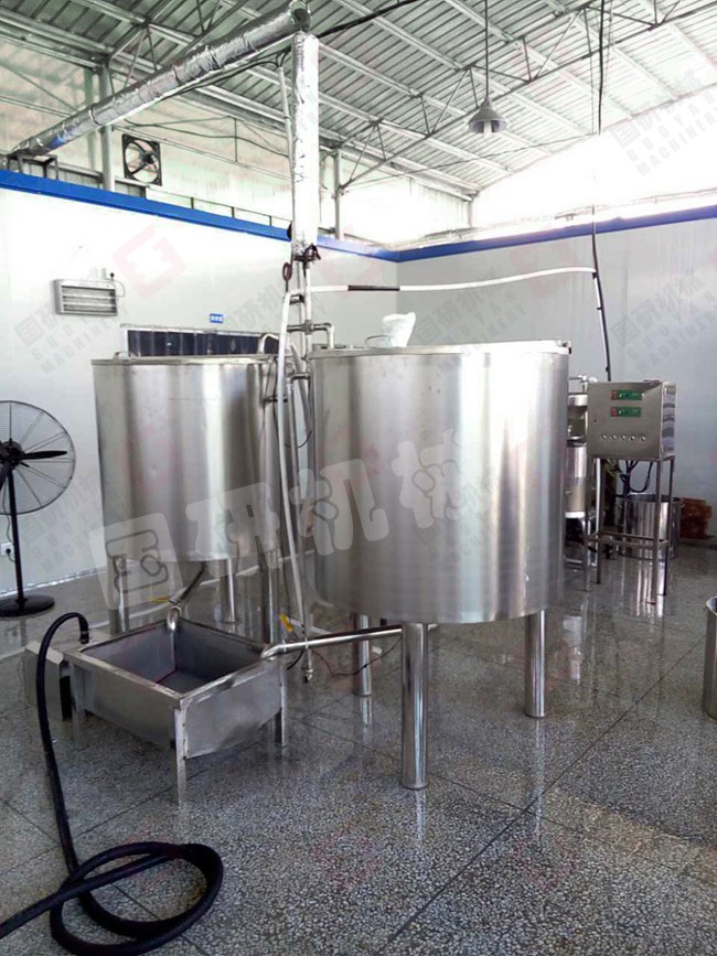 加工豆腐有六道工序:清洗浸泡(夏天4個小時,冬天6個小時,目的是更大限度的確保出漿率)—磨漿分離(傳統(tǒng)工藝需要人工篩漿,而機器是采用漿渣自動分離,減輕了人力,極大提高生產(chǎn)效率)—高溫煮漿(豆?jié){自動流入煮漿桶,通過蒸汽加熱煮熟)—點漿(豆?jié){煮開后,再加入凝固劑成型)—壓榨(擠出水份)—成品豆腐。